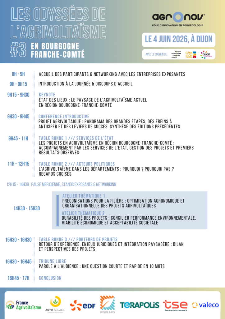 La 3ème édition, prévue le 4 juin 2026, s’inscrit dans cette dynamique de maturation. Elle ambitionne de consolider les acquis, d’approfondir les connaissances autour des problématiques actuelles, afin de structurer une filière agrivoltaïque responsable, durable et créatrice de valeur.